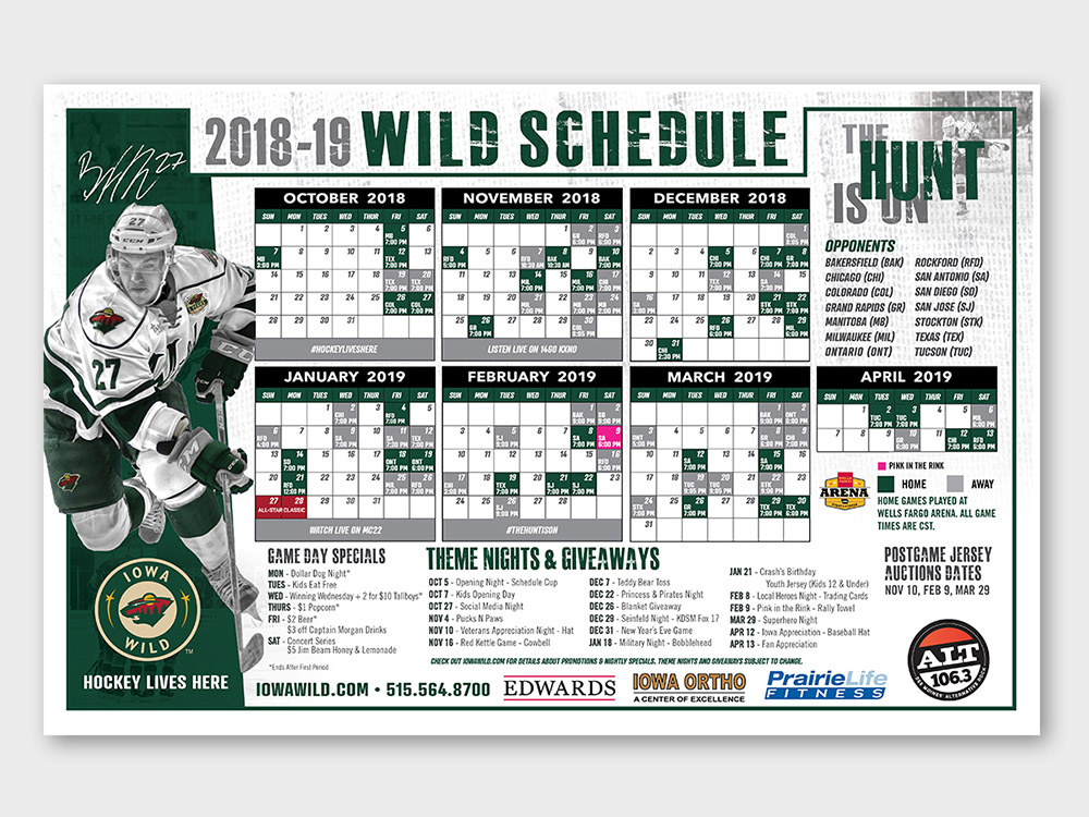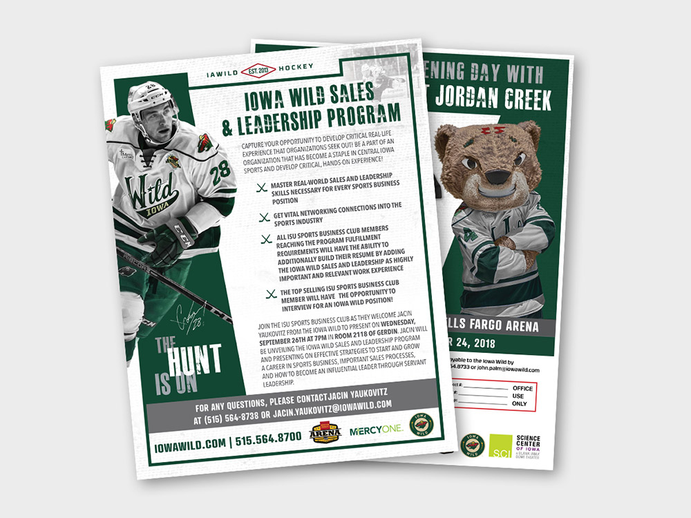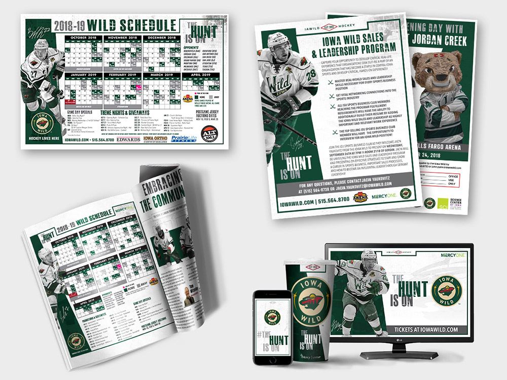 Part of my responsibilities as the Creative Director of the Iowa Wild is to develop a “season look” for each hockey season. The season look is then used across all platforms including sales flyers, promotional items, local advertising, web and social media.